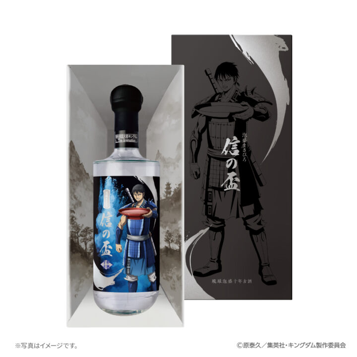 「泡盛まさひろ 信の盃/王騎の盃」は、10年の歳月をかけて熟成した泡盛古酒(クース)とアニメ『キングダム』がコラボした、限定デザインボトルです。人気キャラクター「信(しん)」と「王騎(おうき)」の、オリジナル描き下ろしイラストラベル&アクリルスタンド付きの特別仕様です。